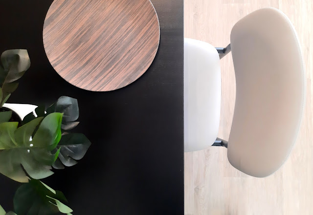 Uitgangspunt: natuurlijk de wensen voor het gebruik, de bruine tint op de wand die er al was en de witte servieskast mocht blijven. Ook spots aan het plafond bleven hangen en wat kunst. Kijk nog even hoe het interieur was: